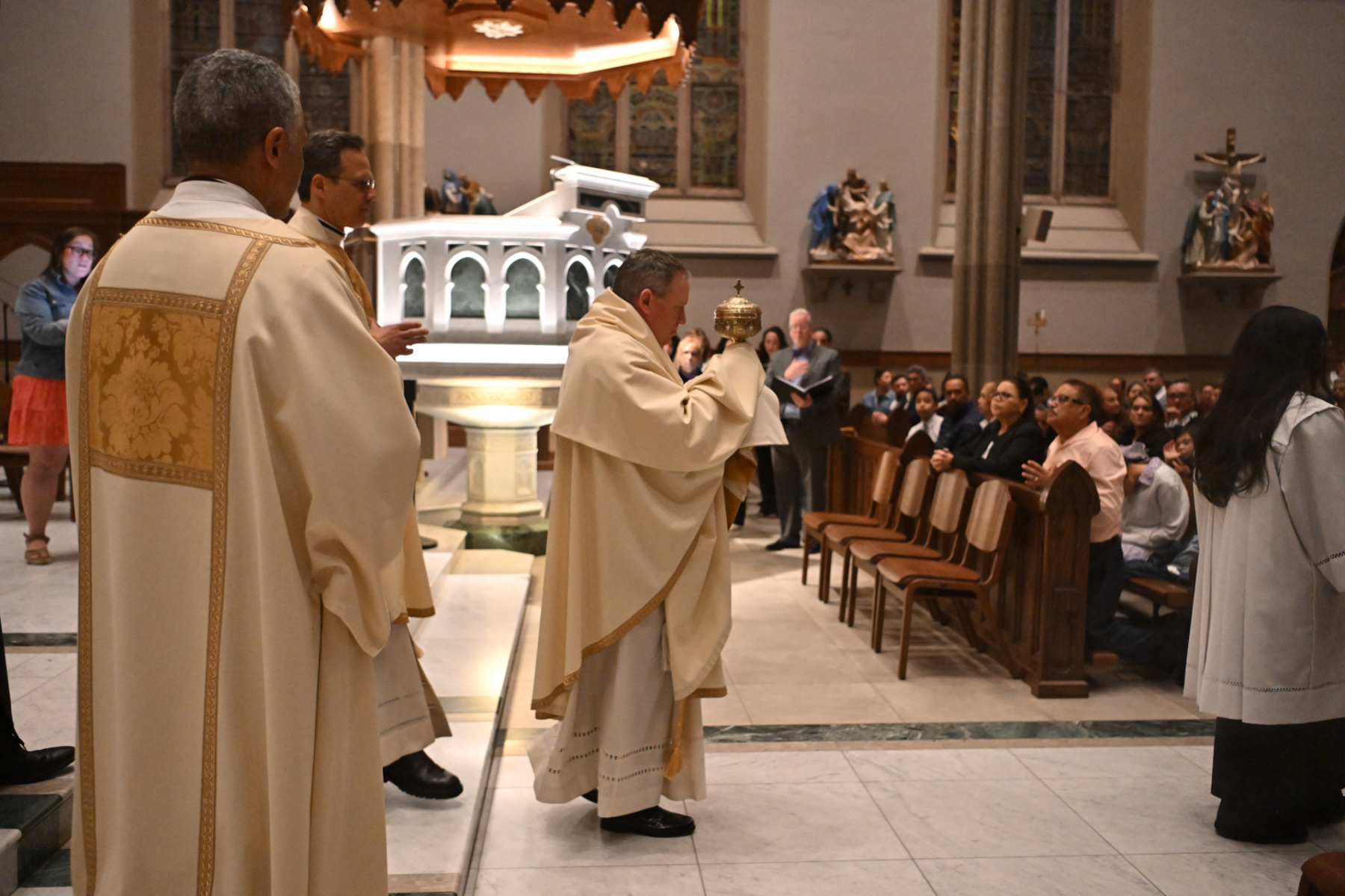 Msgr. Geno Sylva, the cathedral’s rector and diocesan vicar for special projects, concelebrated the Mass with Bishop Sweeney. Father Starli J. Castanos, a St. John’s parochial vicar, was the liturgy’s master of ceremonies. The Mass was followed by an outdoor procession with the Blessed Sacrament to the gym, where adoration was held until midnight.