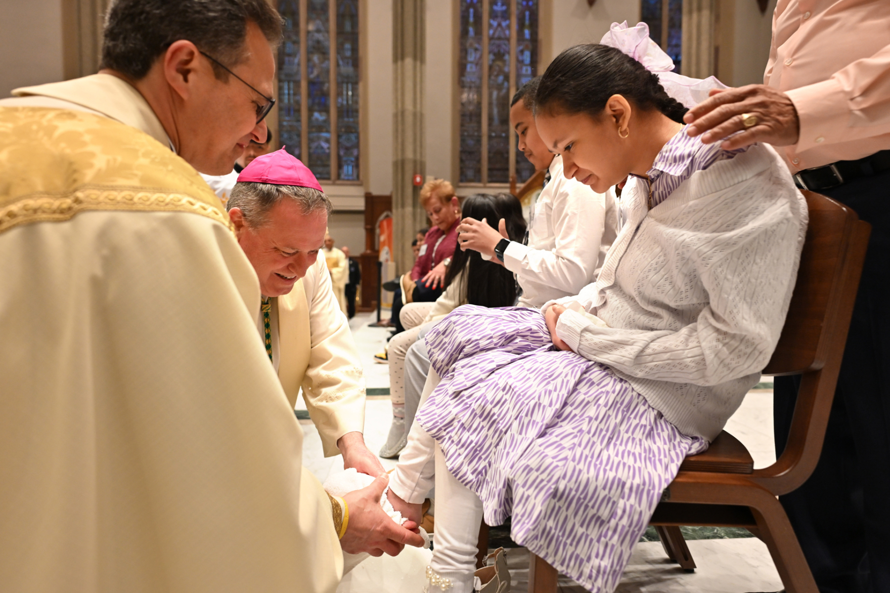 The Mass commemorates Jesus’ institution of the Holy Eucharist and the priesthood in Holy Orders. Just as Jesus washed his disciples’ feet at the Last Supper, Bishop Sweeney washed the feet of members of St. John’s Special Needs Ministry, mostly youth, to symbolize the service and charity of Christ, who came “not to be served, but to serve.” By example of washing his disciples’ feet, Jesus demonstrated how Christians are to love one another through humble service.