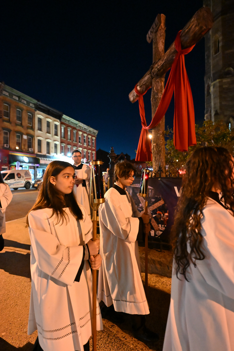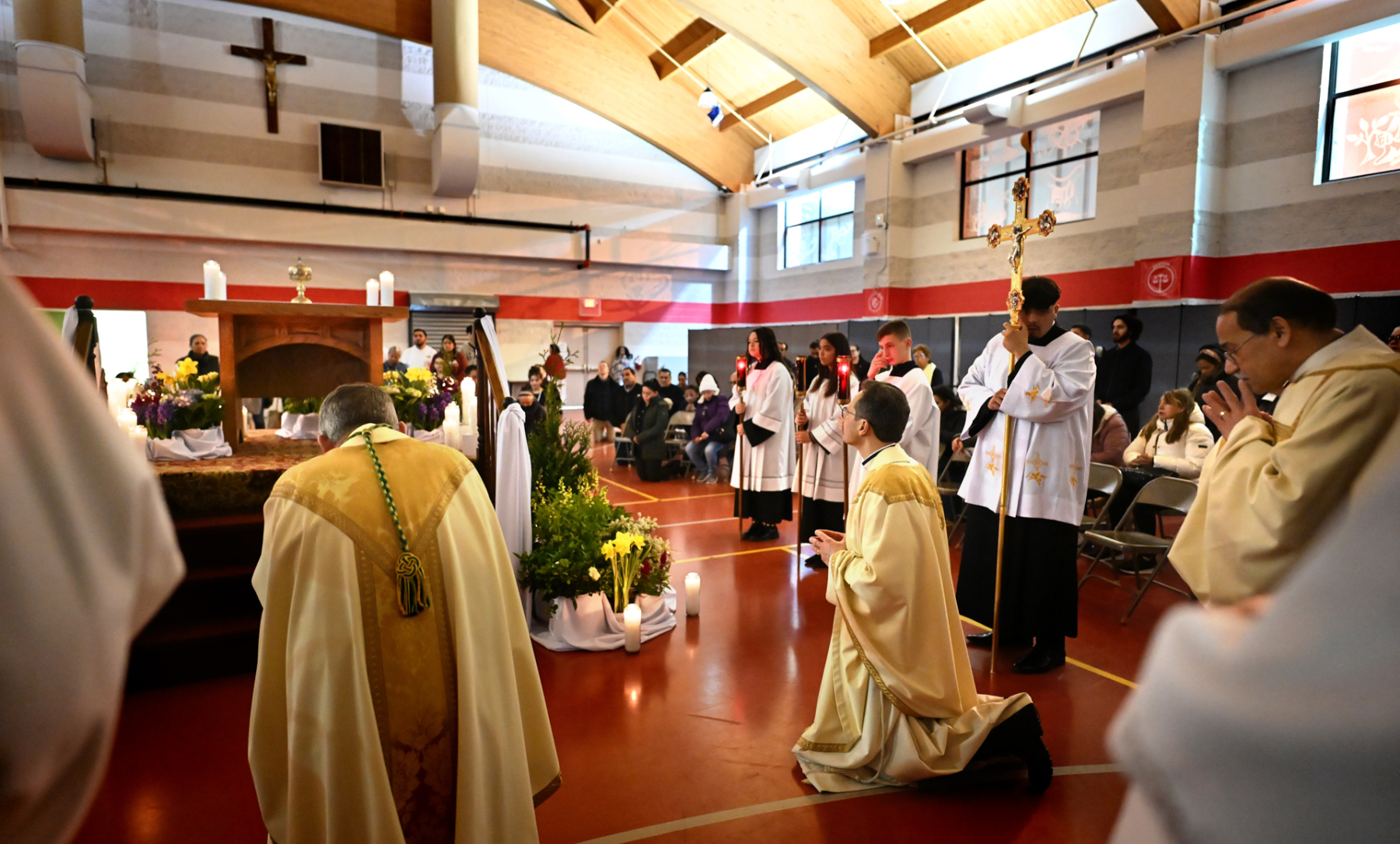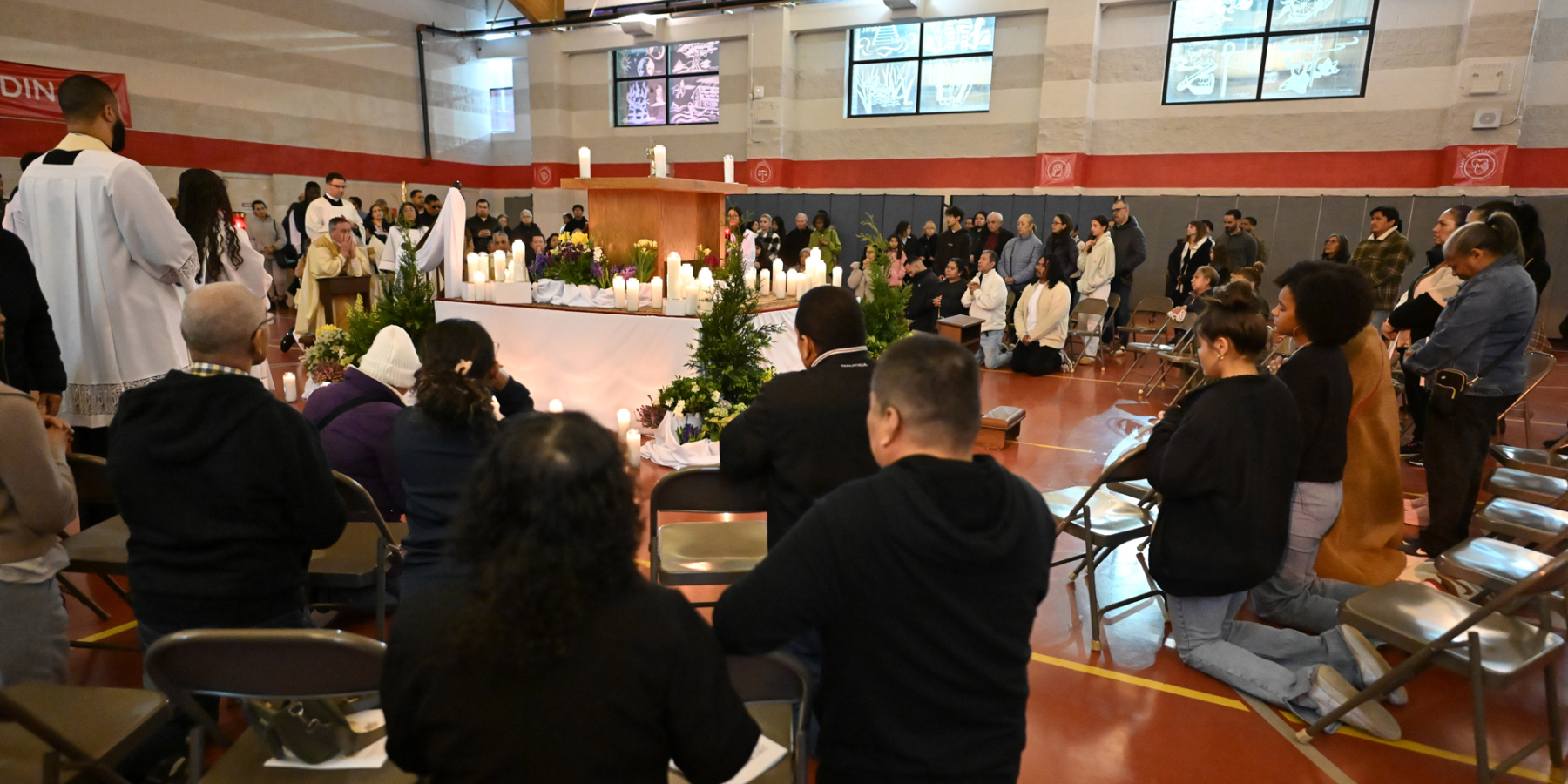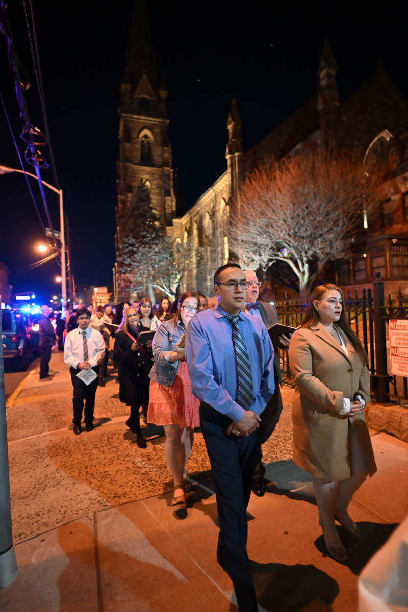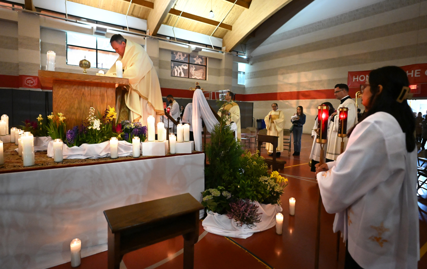 Msgr. Geno Sylva, the cathedral’s rector and diocesan vicar for special projects, concelebrated the Mass with Bishop Sweeney. Father Starli J. Castanos, a St. John’s parochial vicar, was the liturgy’s master of ceremonies. The Mass was followed by an outdoor procession with the Blessed Sacrament to the gym, where adoration was held until midnight.