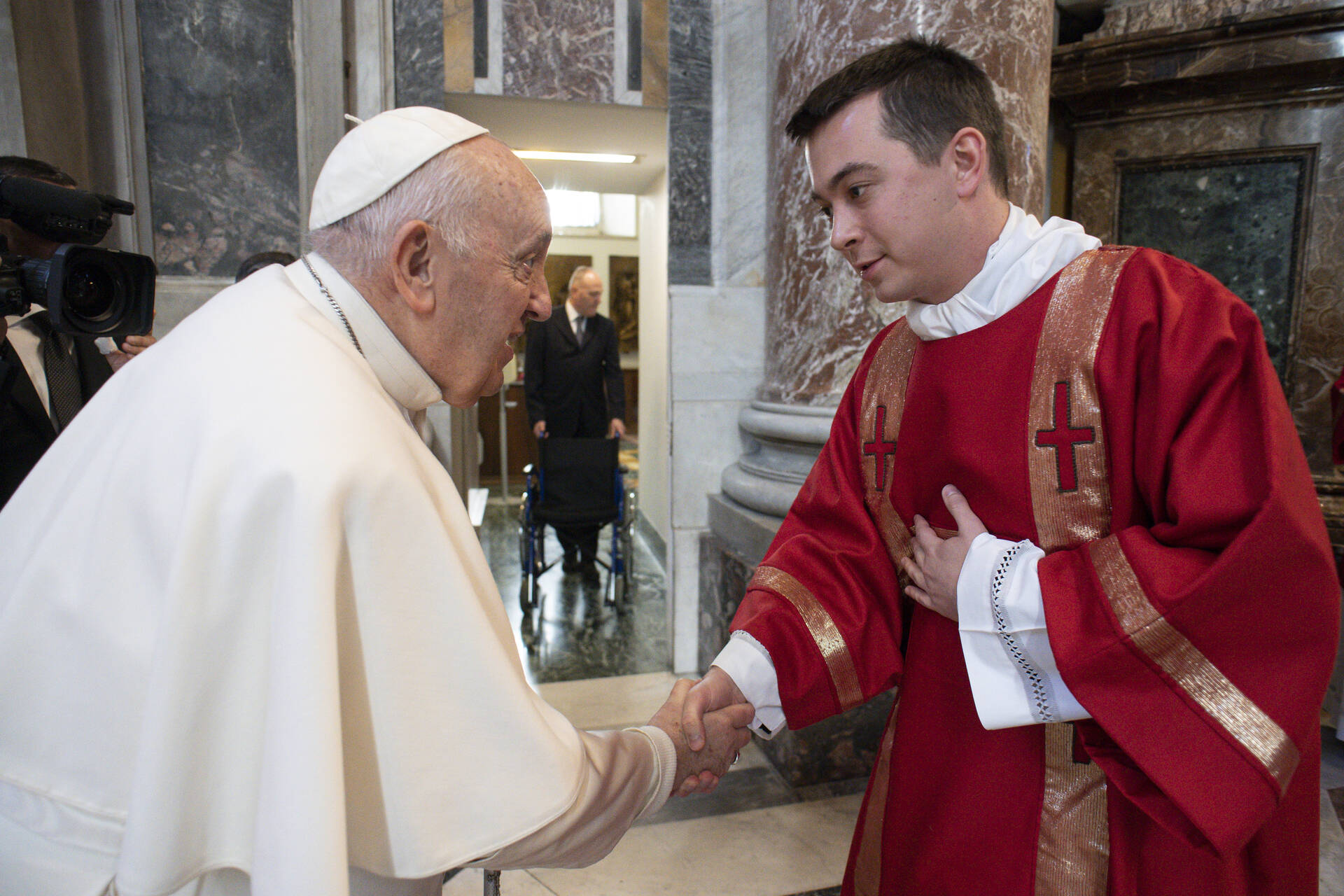 Many diocesan priests and seminarians met Pope Francis while studying in Rome. One of them was Father Krzysztof Tyszko, parochial vicar of Assumption Parish in Morristown, ordained a diocesan priest in 2023. He especially remembers meeting the pontiff before serving as a deacon for one of the papal liturgies.