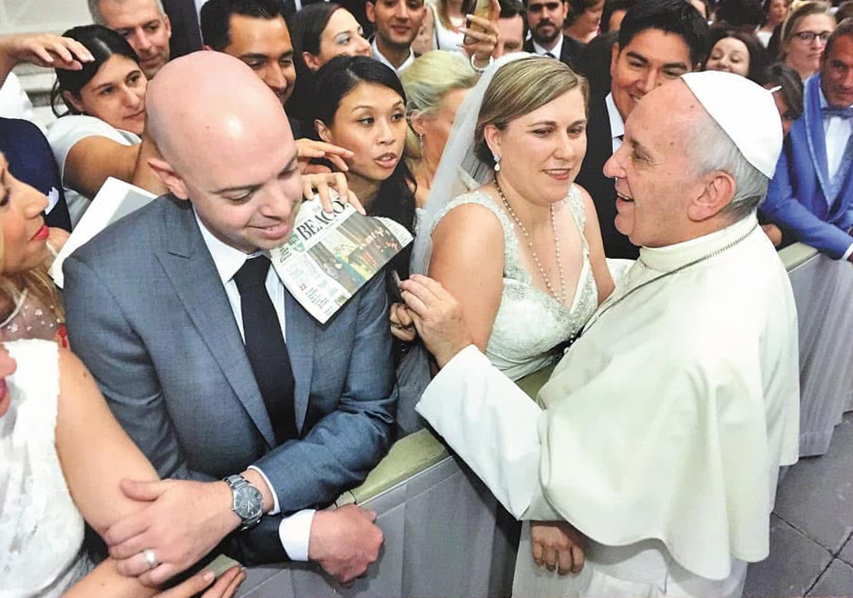 Some people met Pope Francis while on vacation. Cecile Pagliarulo, diocesan digital media specialist, received his “Sposi Novelli” blessing in Rome in 2016 with her husband, Carmine, on their honeymoon in a papal audience with other newly married couples. At the time, she told him she was a reporter for The Beacon and presented him with a copy of the paper. In English, the Holy Father said to the couple “with a big smile, ‘Pray for me.'” The Vatican News photo was featured on The Beacon’s front page.