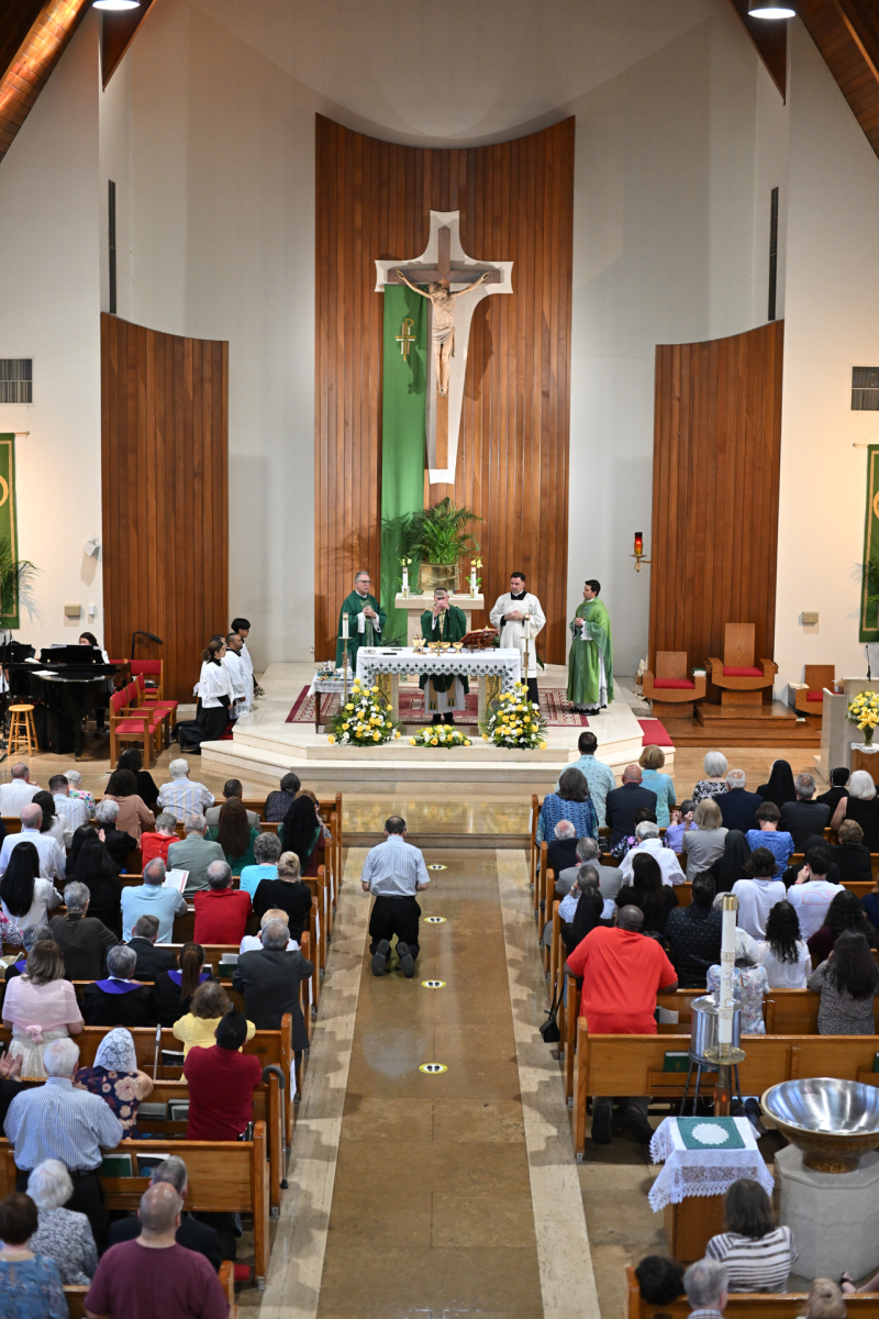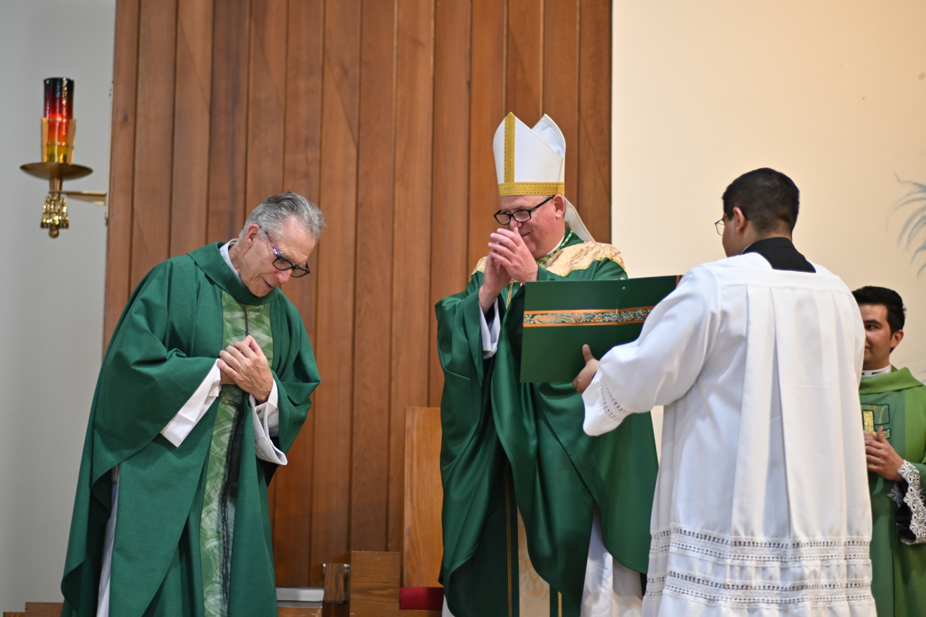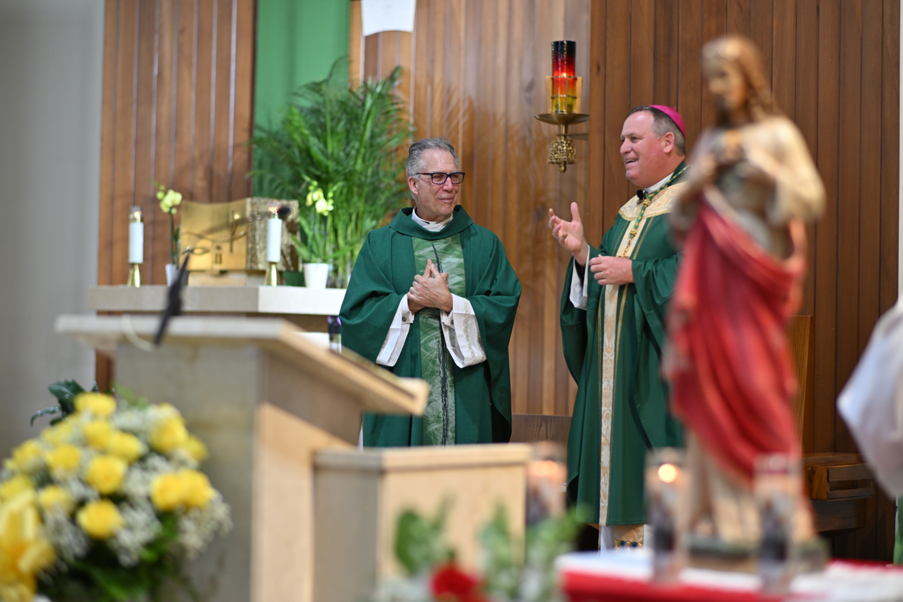 Bishop Kevin J. Sweeney installed Msgr. George Hundt in Paterson and Father Manuel Cuellar as its parochial vicar on June 8, during a Mass in English and Spanish. Parishioners, members of the parish school, family, and friends filled the church. Family and repre-sentatives of religious groups, committees, and staff participated in the liturgy. Msgr. Hundt and Father Cuellar were assigned to St. Gerard’s on July 1, 2023, following the departure of Vocationist priests and sisters, members of the Society of Divine Vocations. The religious order served the ethnically diverse faith community for 15 years prior. Last summer, it handed the administration of St. Gerard’s back to the Paterson Diocese. Msgr. Hundt first served as the parish’s pastor from 1995 to 2002.