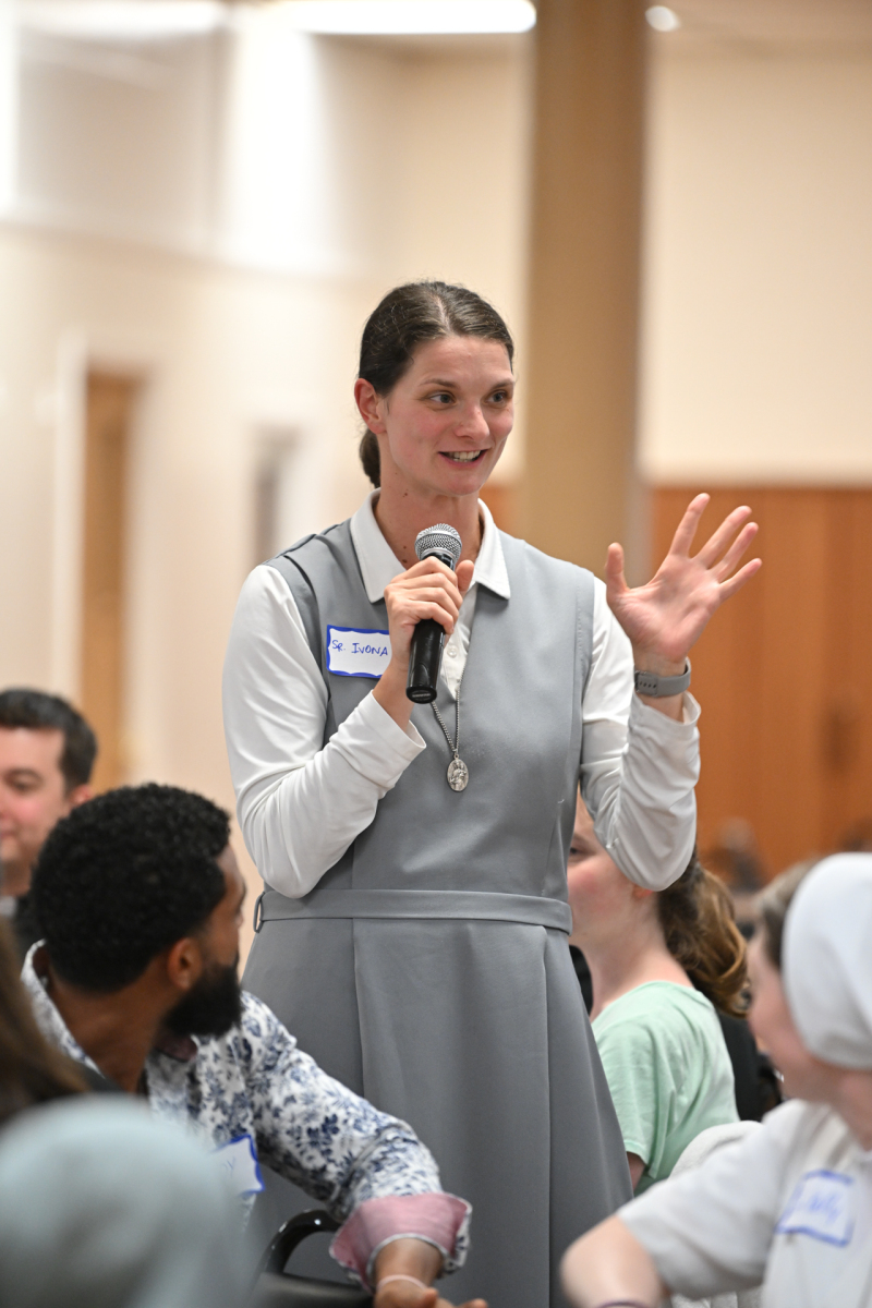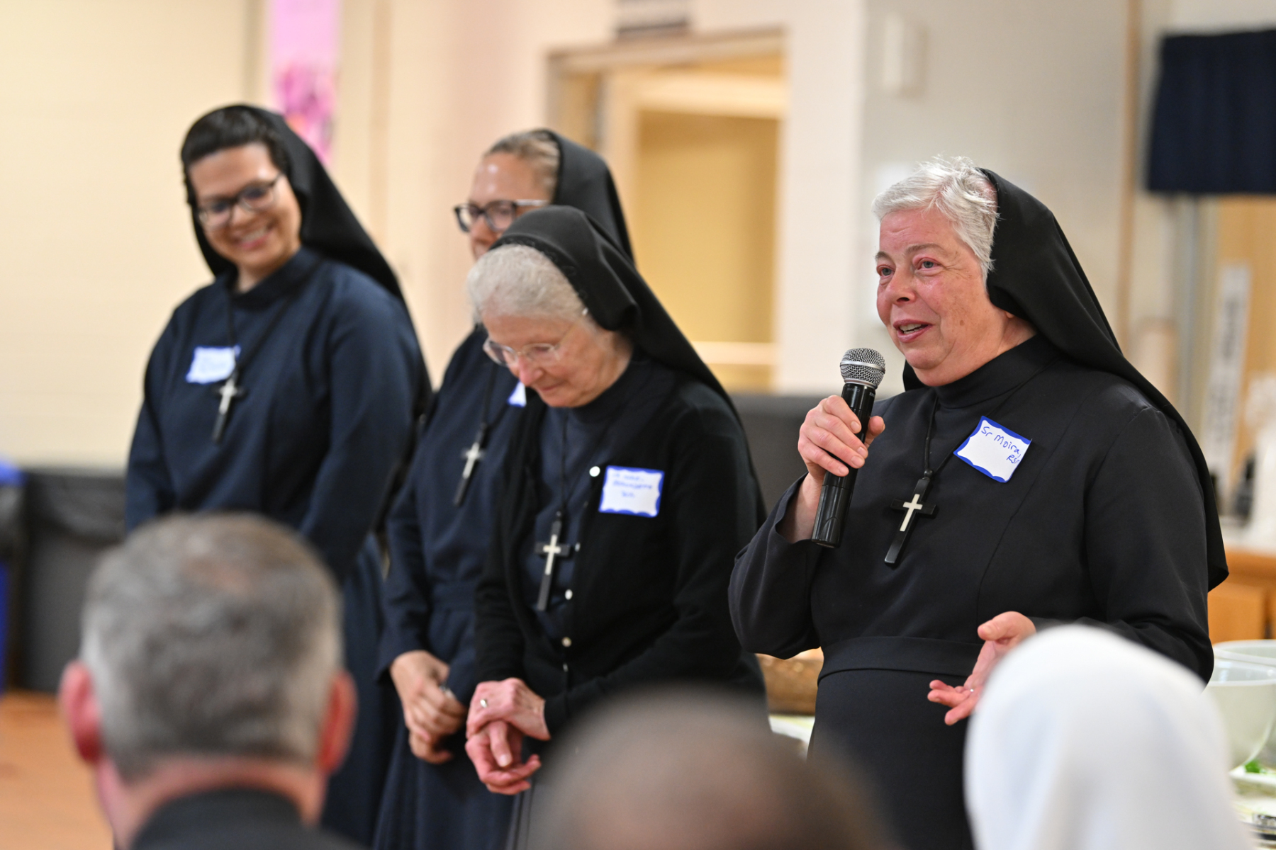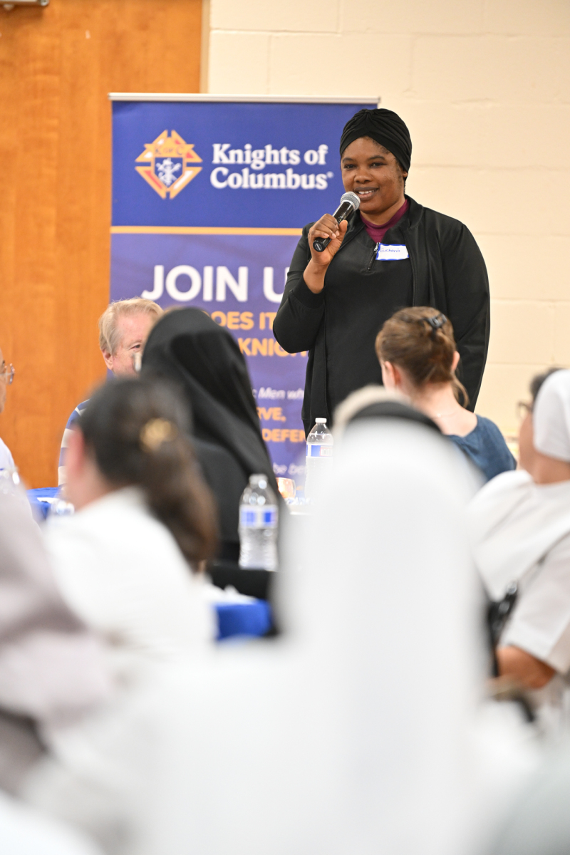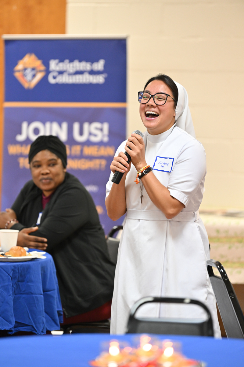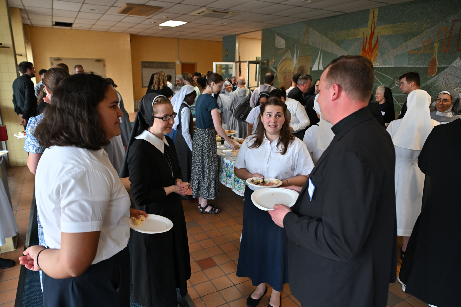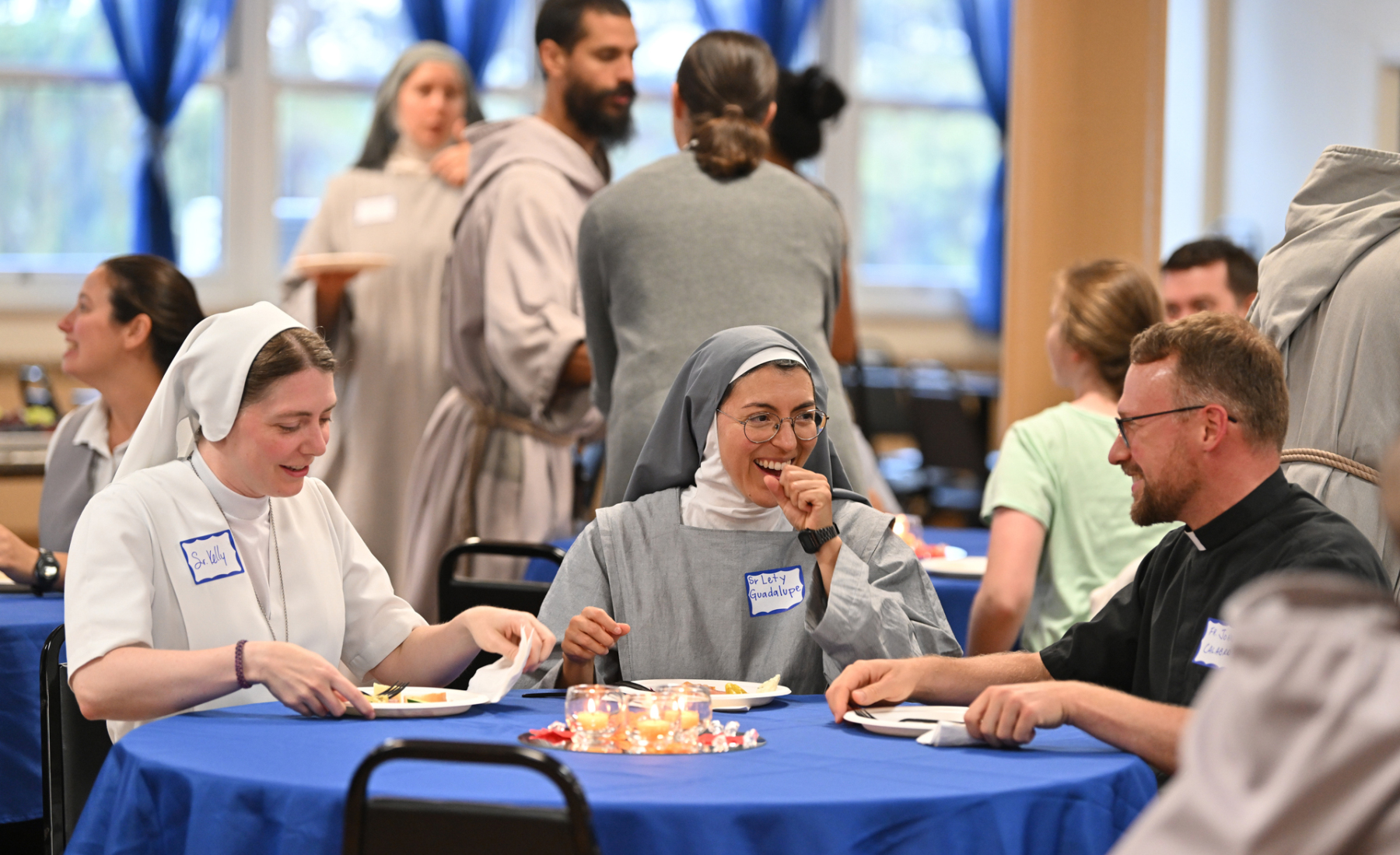Then, participants ate dinner together in the school cafeteria, catered by Personal Touch. Members of various religious communities mingled at the tables to get to know one another. Also, all the new religious men and women serving the diocese had the opportunity to introduce themselves, including a new community, the Religious Sisters of Mercy of Alma.