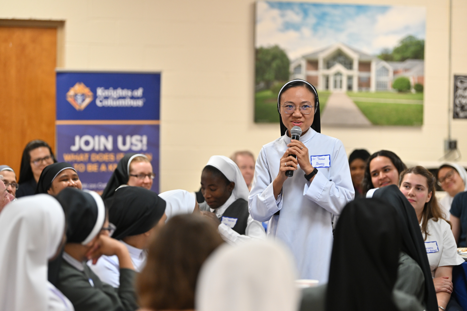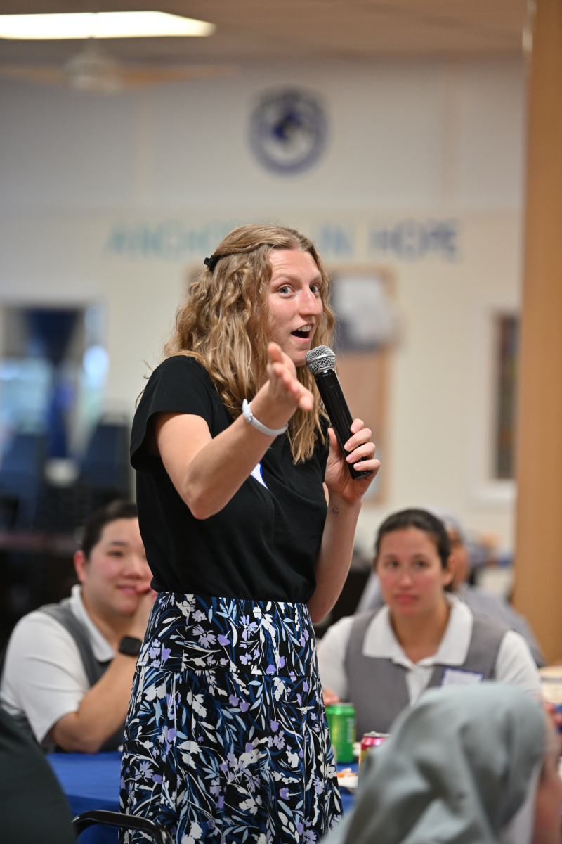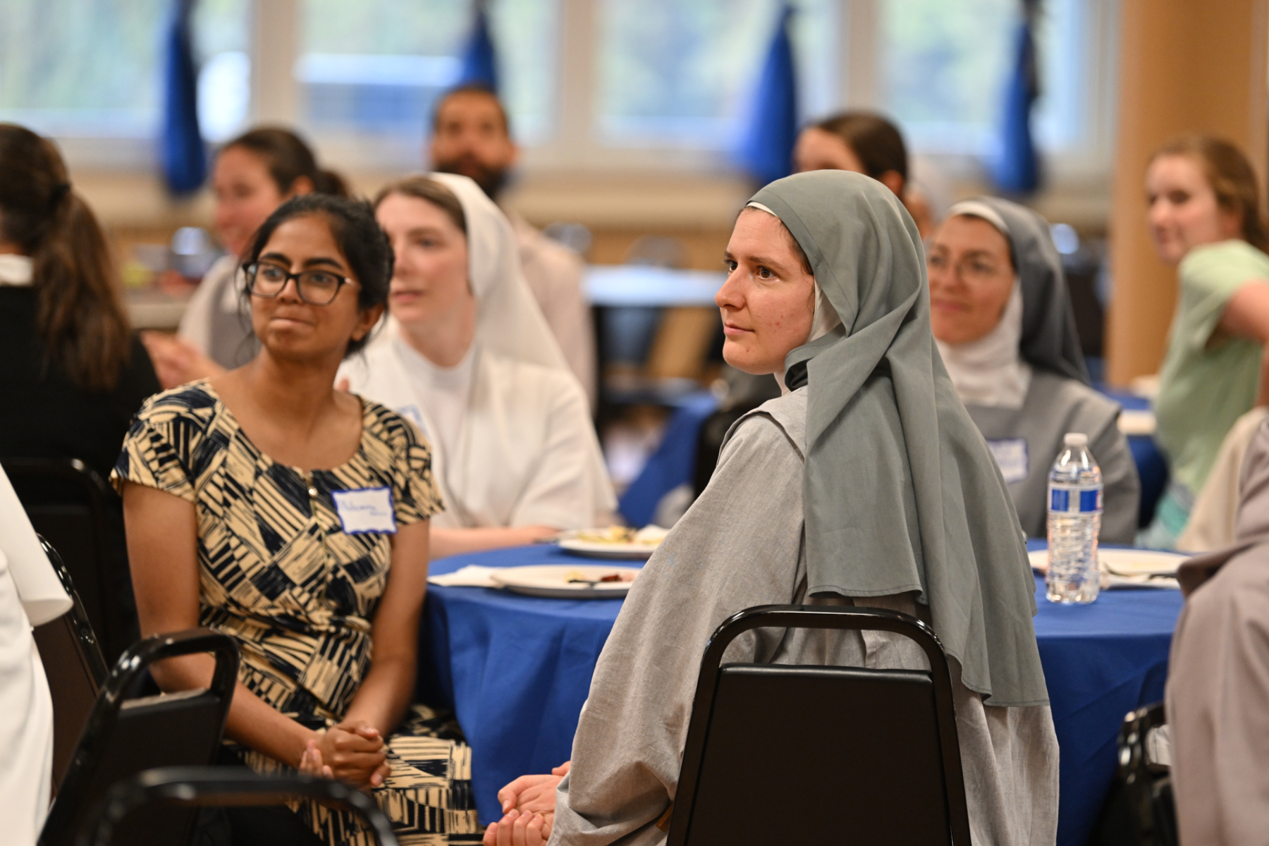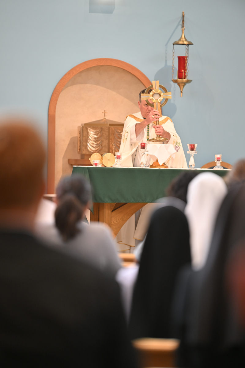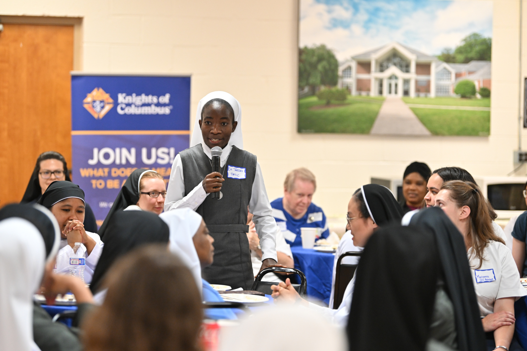 Then, participants ate dinner together in the school cafeteria, catered by Personal Touch. Members of various religious communities mingled at the tables to get to know one another. Also, all the new religious men and women serving the diocese had the opportunity to introduce themselves, including a new community, the Religious Sisters of Mercy of Alma.