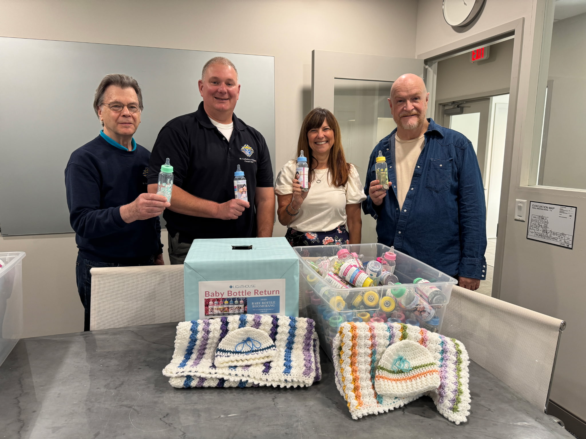 Debbie Provencher, director of Lighthouse Pregnancy Resource Center in Hawthorne, N.J., received donations from Anthony Lanza, grand knight of the Knights of Columbus Council 6212 of St. Catherine of Bologna Parish in Ringwood, N.J., and John Myshkoff and Robert McKay, fourth degree knights, on behalf of the parish. Donations included $3,800 in cash, collected by parish families in the baby bottles shown, and crocheted blankets for newborns. The knights support Lighthouse, which provides ultrasound diagnosis and training in parenting, career, and healthcare for parents in need.