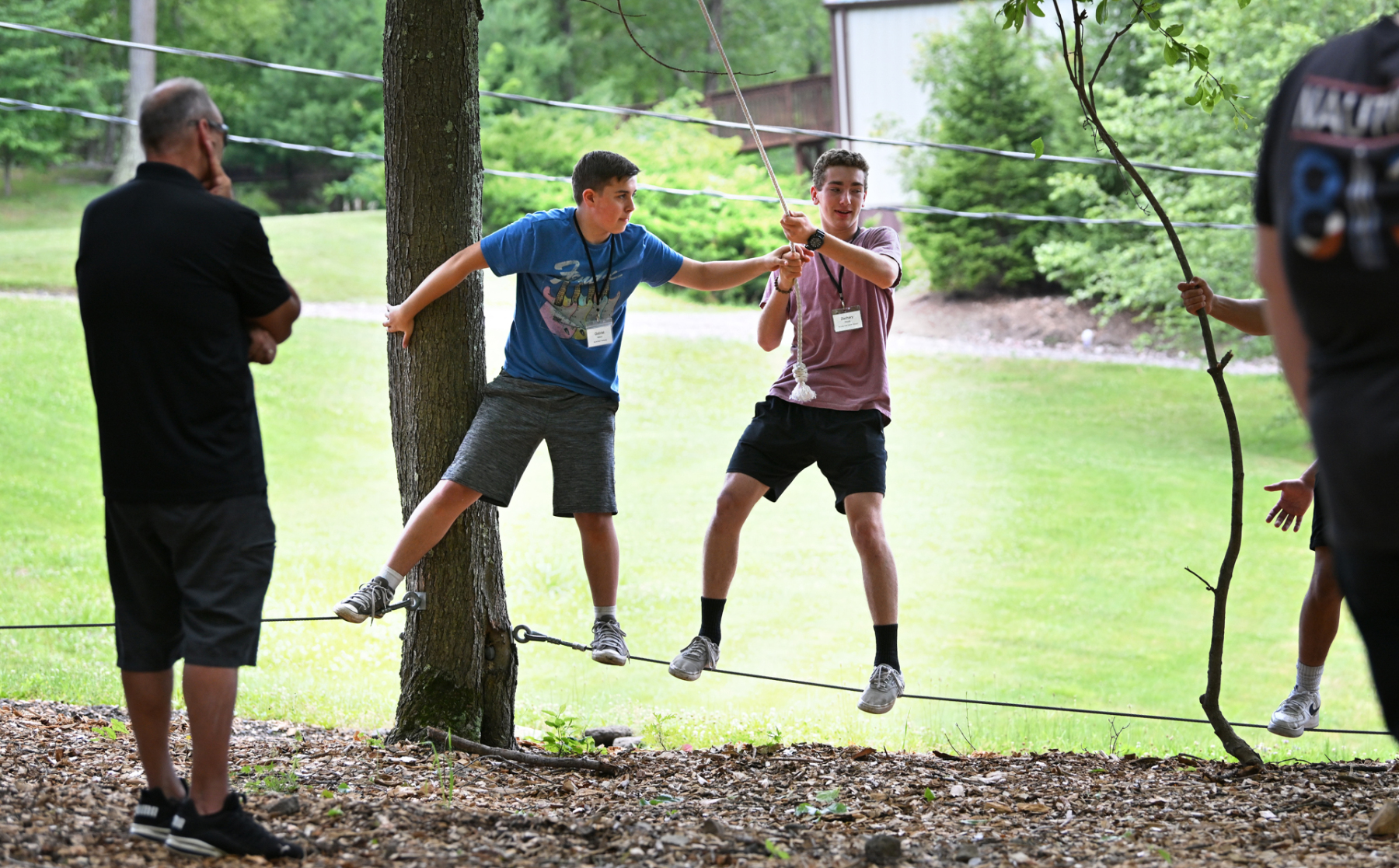 Several other Catholic young men followed Wensuslaus onto the rope bridge, part of a Chal-lenge Course they attempted at the Quo Vadis Day 2024 discernment retreat on June 27. Quo Vadis — Latin for “Where are you going?” — allowed him and 44 other participating teens to ask God, themselves, and each other that same question: “Where am I going with my life?”For Wensuslaus, navigating the rope bridge symbolizes his challenge of choosing between two possible calls he sees teeter in front of him: married life or the priesthood. He attended the all-day retreat with a group from his parish, St. Lawrence the Martyr in Chester. The retreat was held at Shiloh Bible Camp in the Hewitt neighborhood of West Milford.